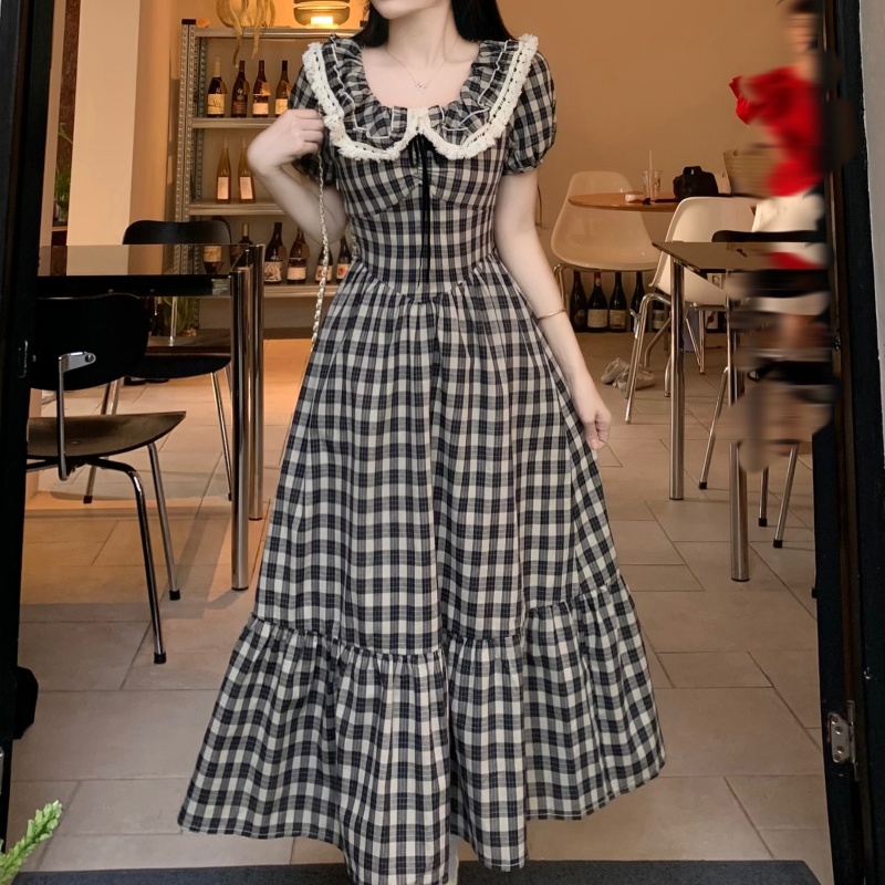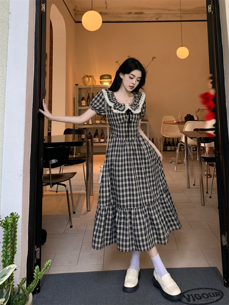 夏季新款小众设计感黑色格纹娃娃领拼接感连衣裙长裙