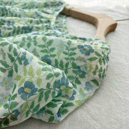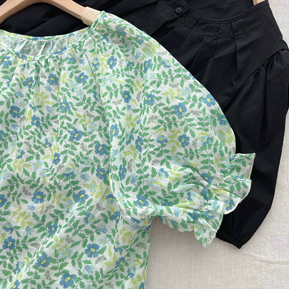定染清爽小绿花天然100支精纺苎麻插肩泡泡短袖女宽松