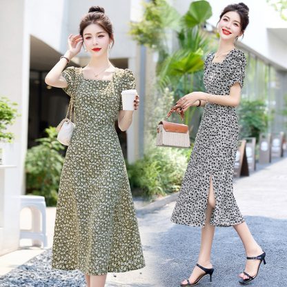 夏季仙女褶皱方领收腰显瘦荷叶边冰丝连衣裙鱼尾包臀短裙子潮