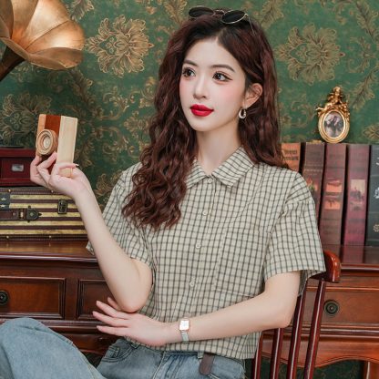 流行复古港风格子短袖衬衫女夏季新款小众衬衣上衣
