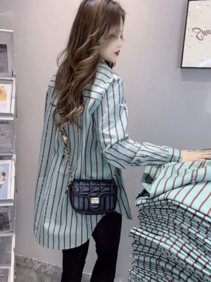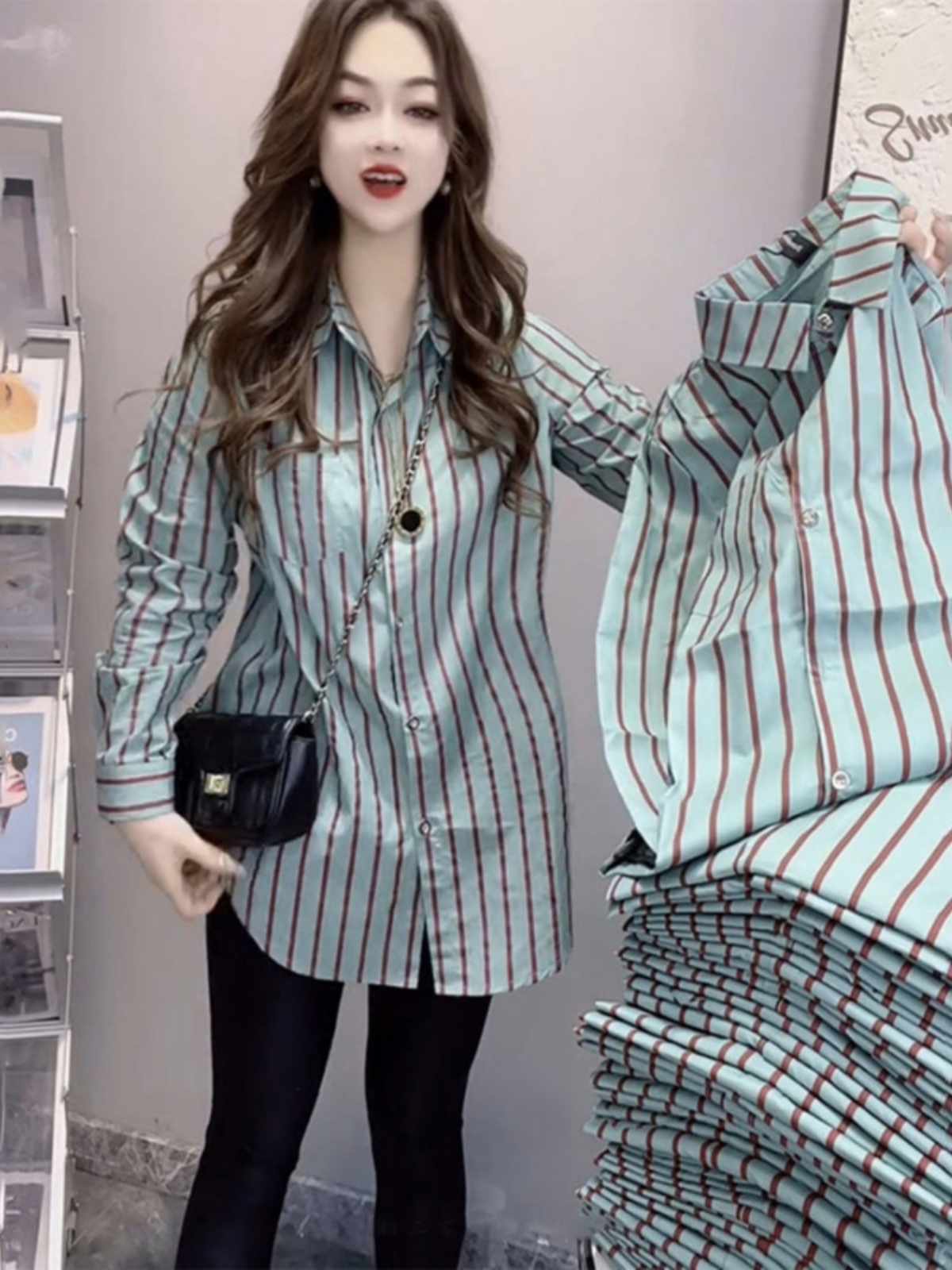 2024春季新款洋气宽松翻领条纹中长款衬衫女装时尚长袖上衣衬衣潮