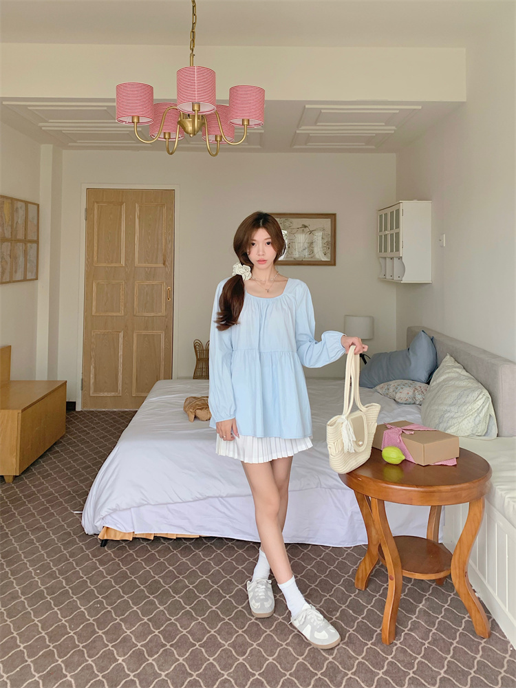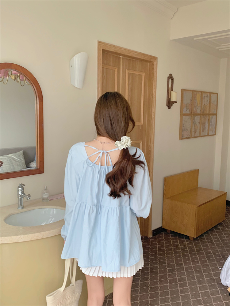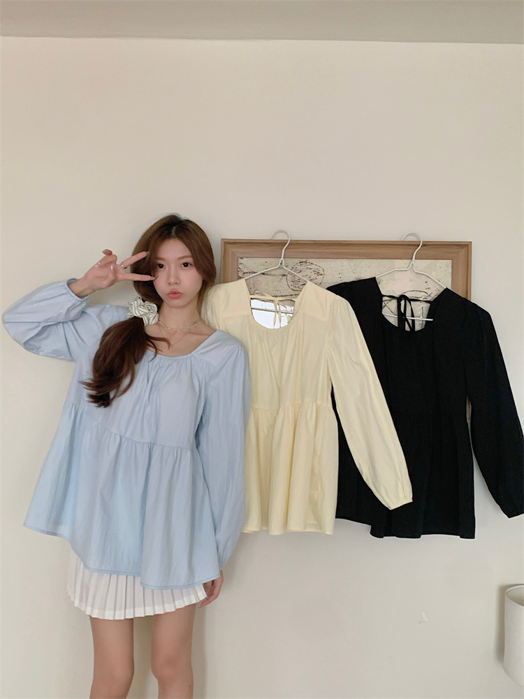 66212大码法式薄款长袖甜美方领正肩短袖衬衫女收腰显瘦上衣